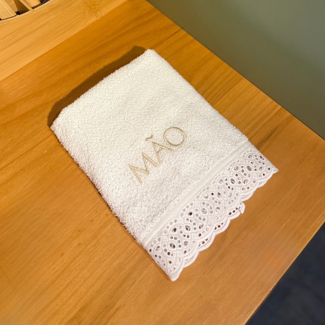 O pano é de algoão (90%) e poliéster (10%) com aplicação de um barrado em algodão (100%).