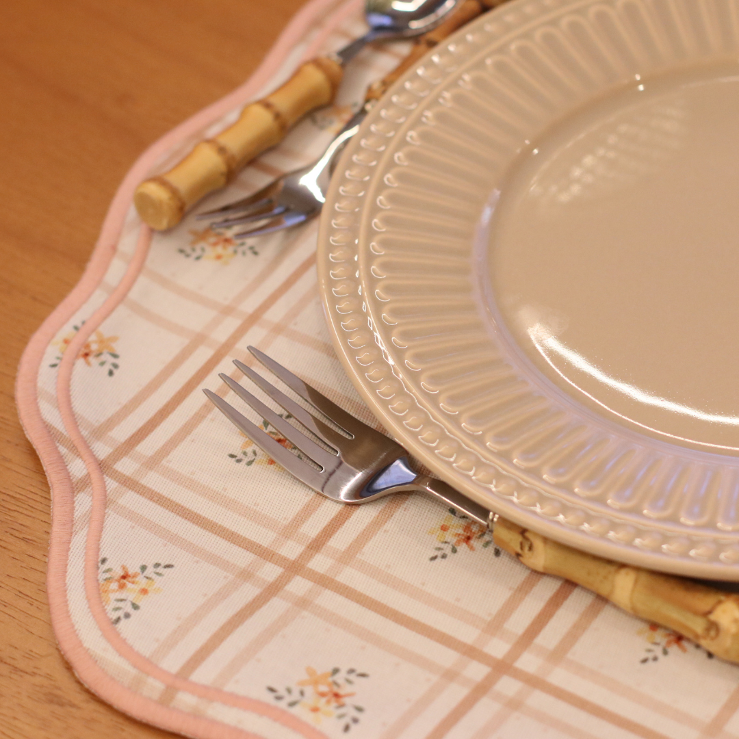 Lugar Americano bordado em tecido 100% algodão semi impermeável na cor rosa com estampa floral e fundo xadrez.