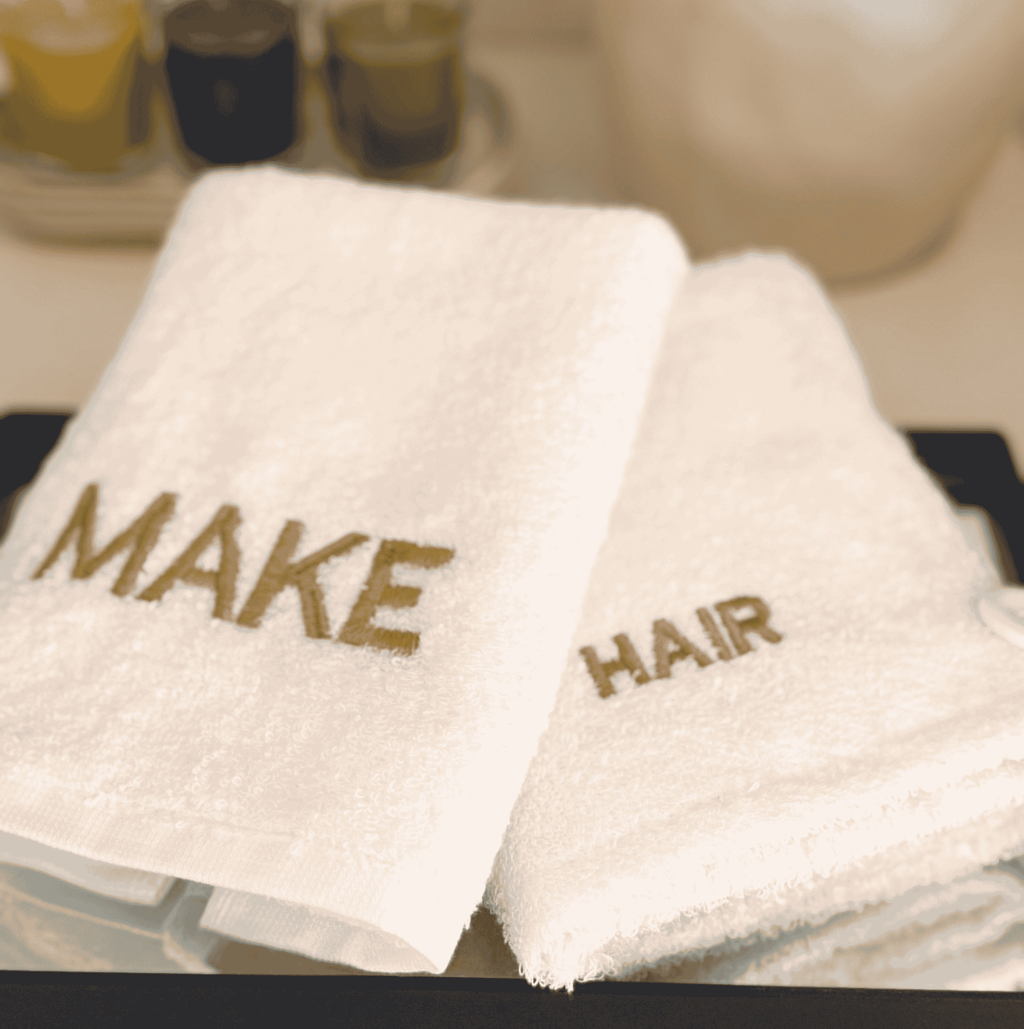 Toalha branca bordada com a palavra "MAKE" para usar quando estiver com os mãos ou o rosto com resquícios de maquiagem.