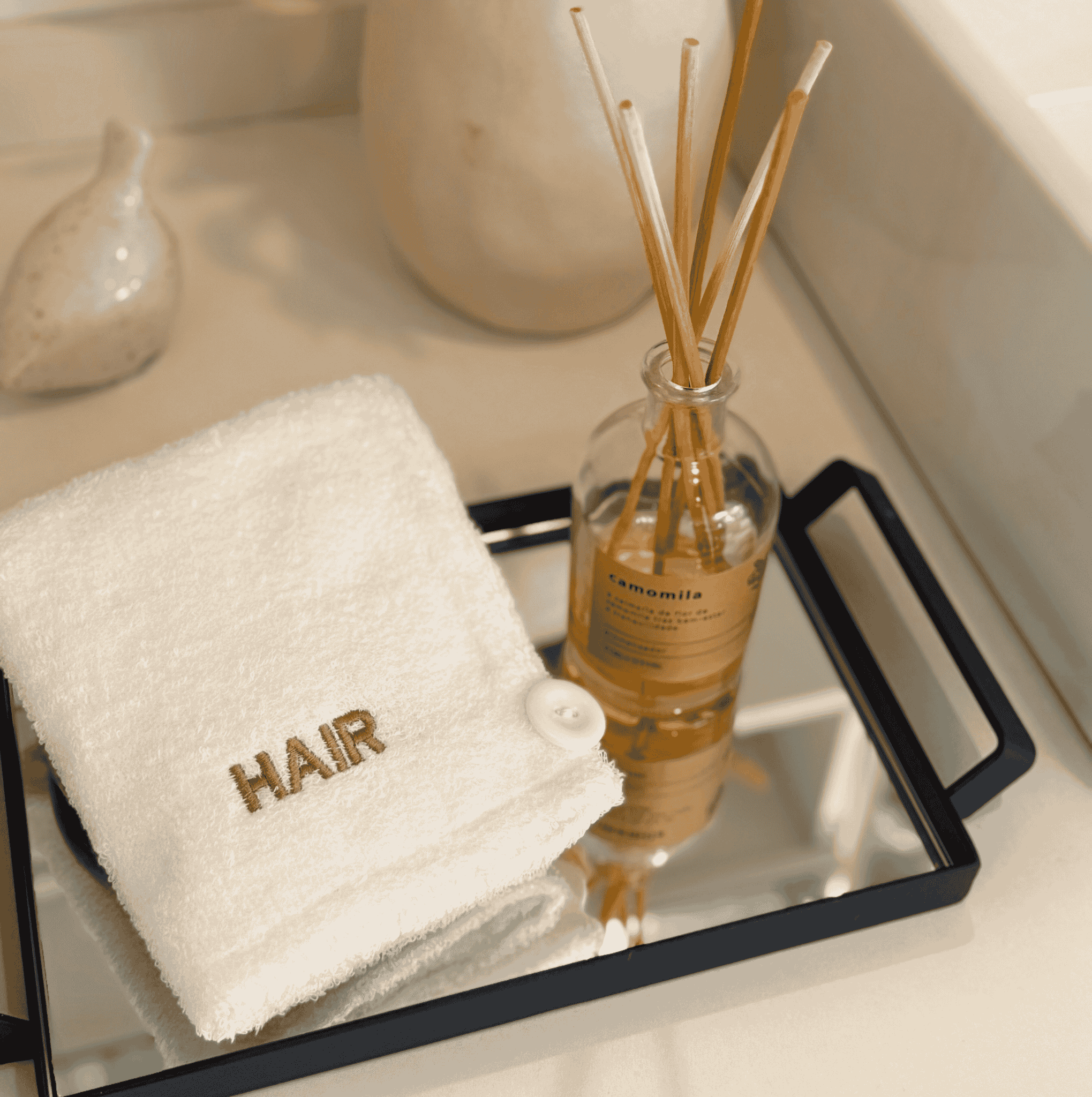 A touca de cabelo de tecido atoalhado permite tirar o excesso de água do cabelo.